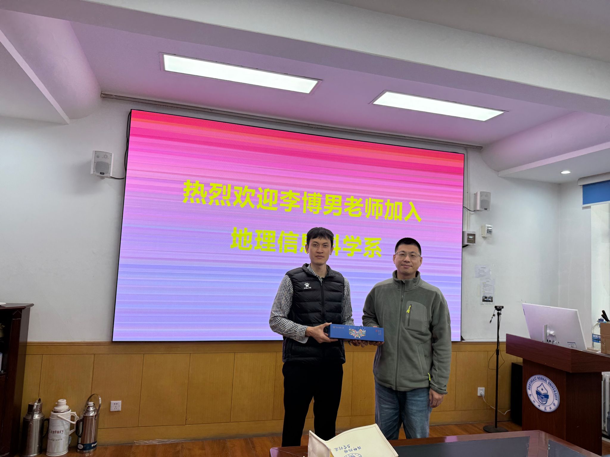 随后,赵建军系主任主持新教师入职欢迎仪式。赵建军老师向全系教师介绍了李博男老师的学术背景和研究方向。李博男老师表达了对加入地理信息科学系大家庭的欣喜之情,并表示将尽快融入团队,积极投身教学和科研工作,为学院发展贡献力量。会上,由孙仲秋副院长代表学院向李博男老师赠送学校和学院文创入职纪念品。