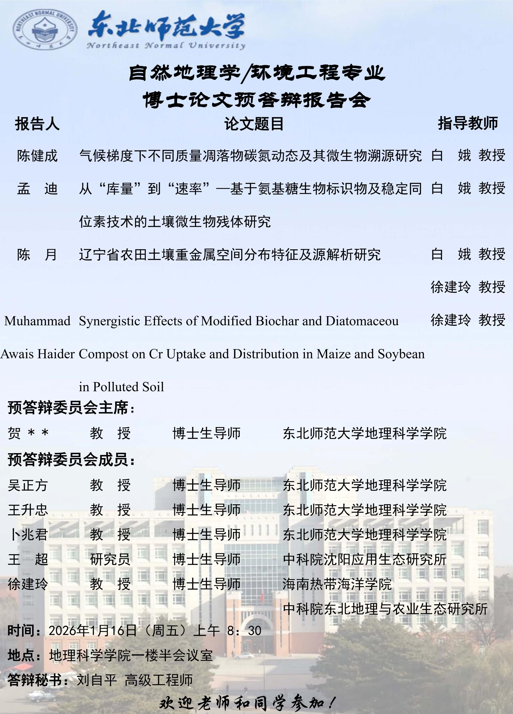 【硕博答辩】自然地理学/环境工程专业博士论文预答辩报告会