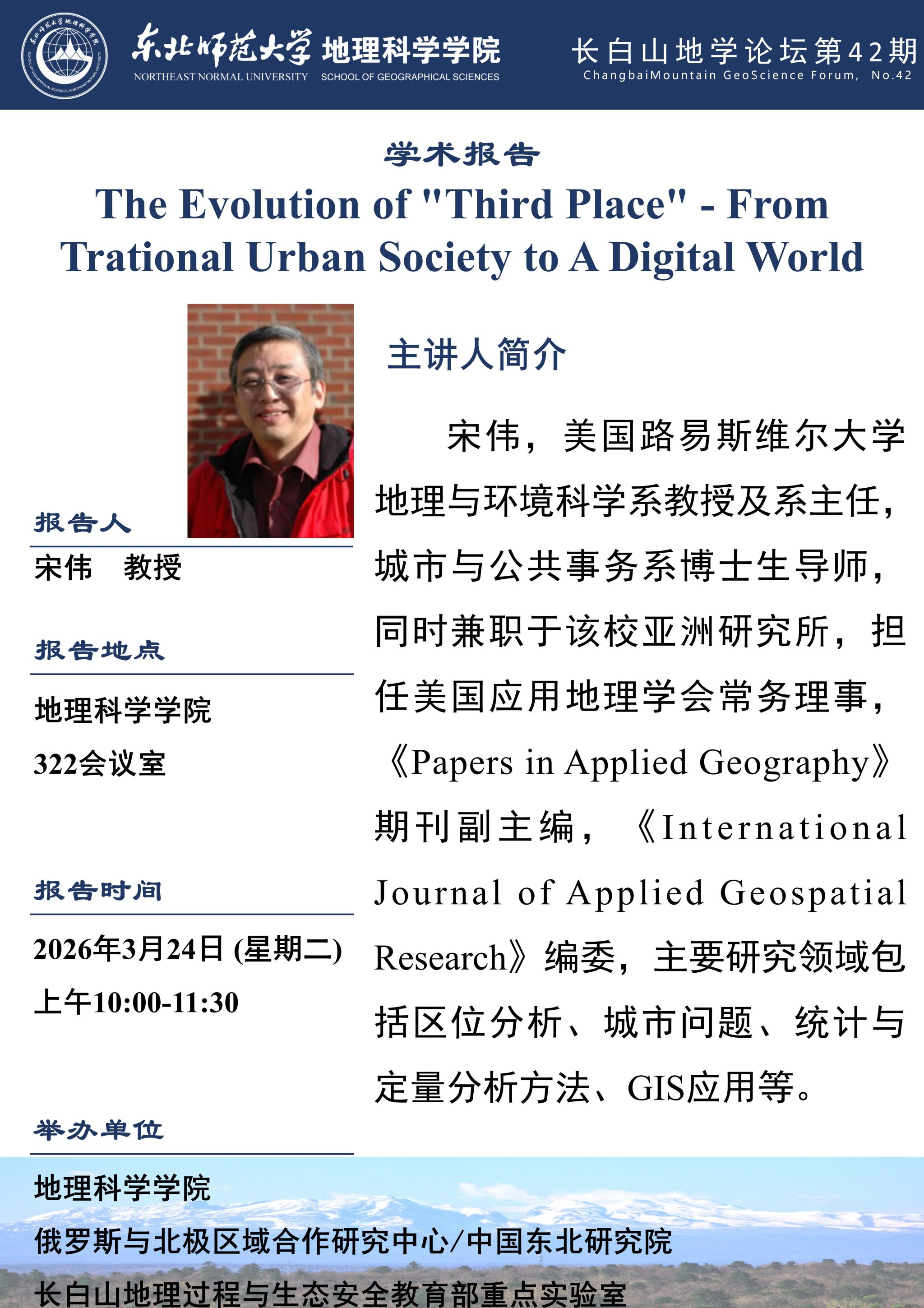 【长白山地学论坛(第四十二期)】宋伟:The Evolution of "Third Place" - From Trational Urban Society to A Digital World