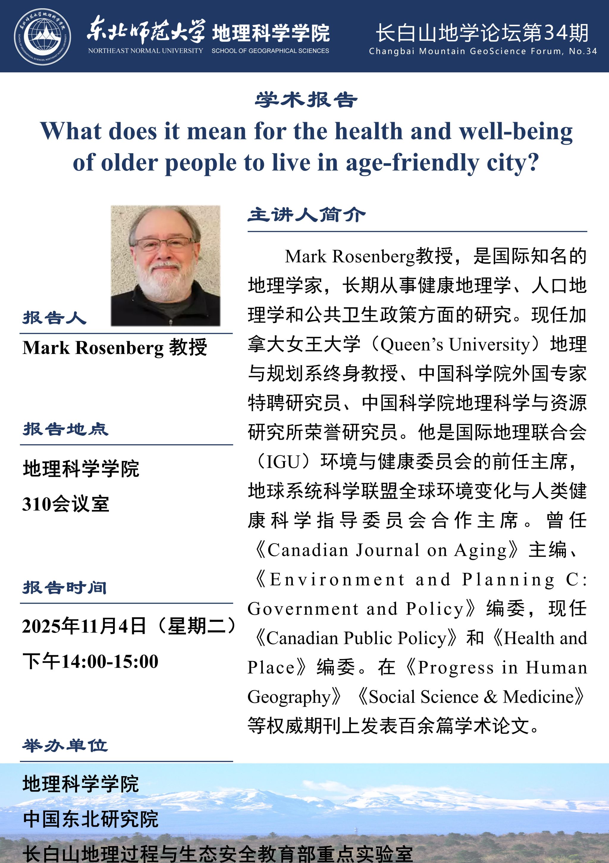 【长白山地学论坛(第三十四期)】Mark Rosenberg:What does it mean for the health and well-being of older people to live in age-friendly city?