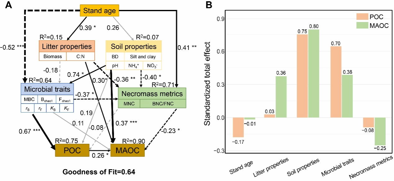 本研究强调了“矿物吸附容量约束”与“微生物群落演替”在限制人工林长期土壤碳固存中的双重作用。在此背景下,于近熟林阶段开展适度采伐或经营管理,有助于缓解土壤碳长期累积受限的问题,并维持森林较高的固碳能力。该研究为完善森林土壤碳循环模型及制定以增汇为目标的人工林经营策略提供了重要科学依据。
