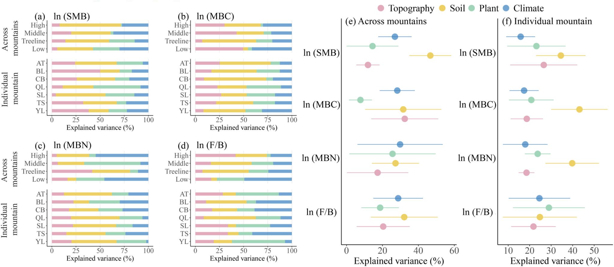 图4 各环境因子与土壤微生物生物量(SMB)、土壤微生物生物量碳(MBC)、土壤微生物生物量氮(MBN)和真菌与细菌之比(F/B)在单个山地样带内和同等海拔山地间的优势分析方差分割结果