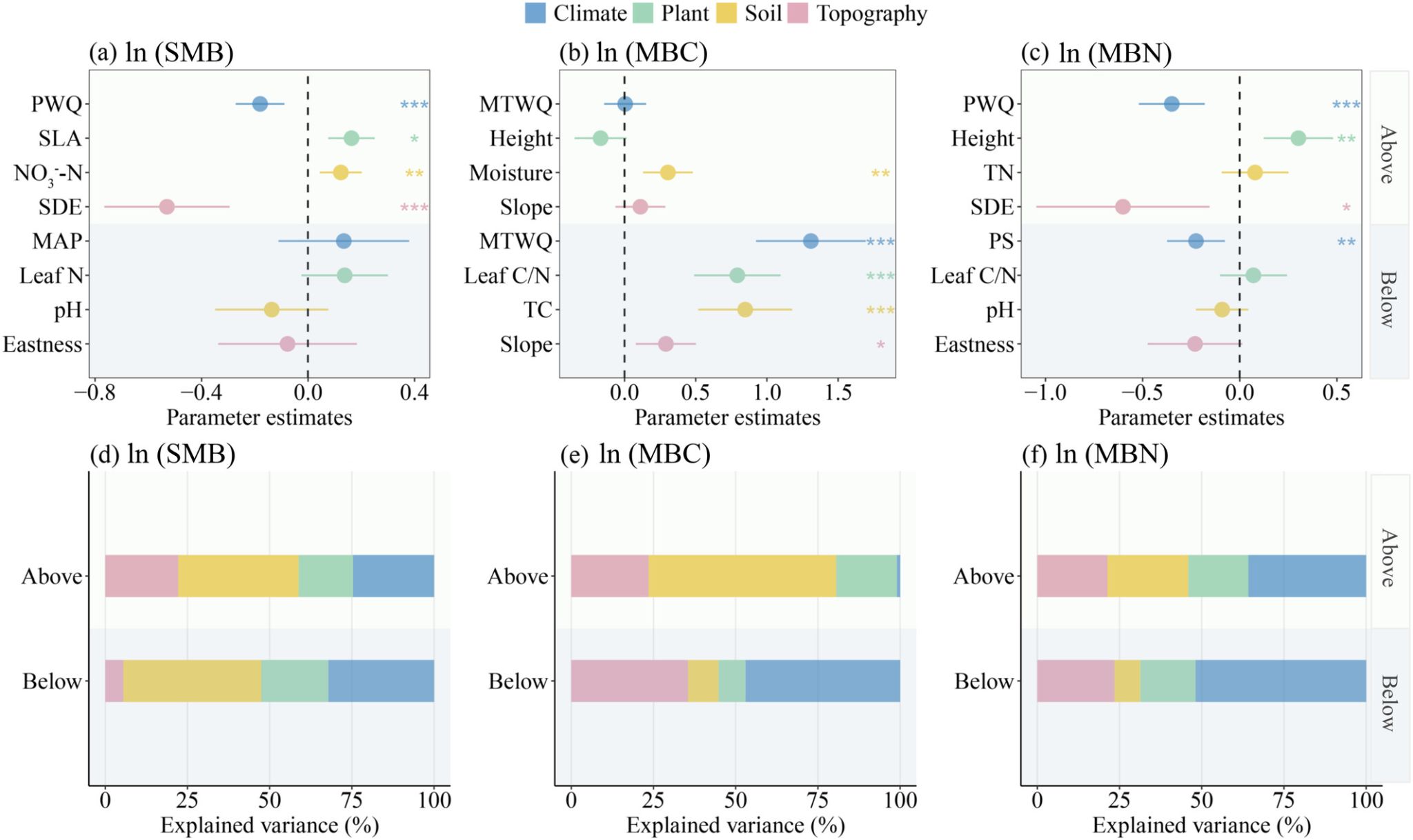图3 基于线性混合效应模型和优势分析方差分割的结果,在海拔阈值以下和以上,对土壤微生物生物量(SMB)、土壤微生物生物量碳(MBC)和土壤微生物生物量氮(MBN)进行环境变量参数估计