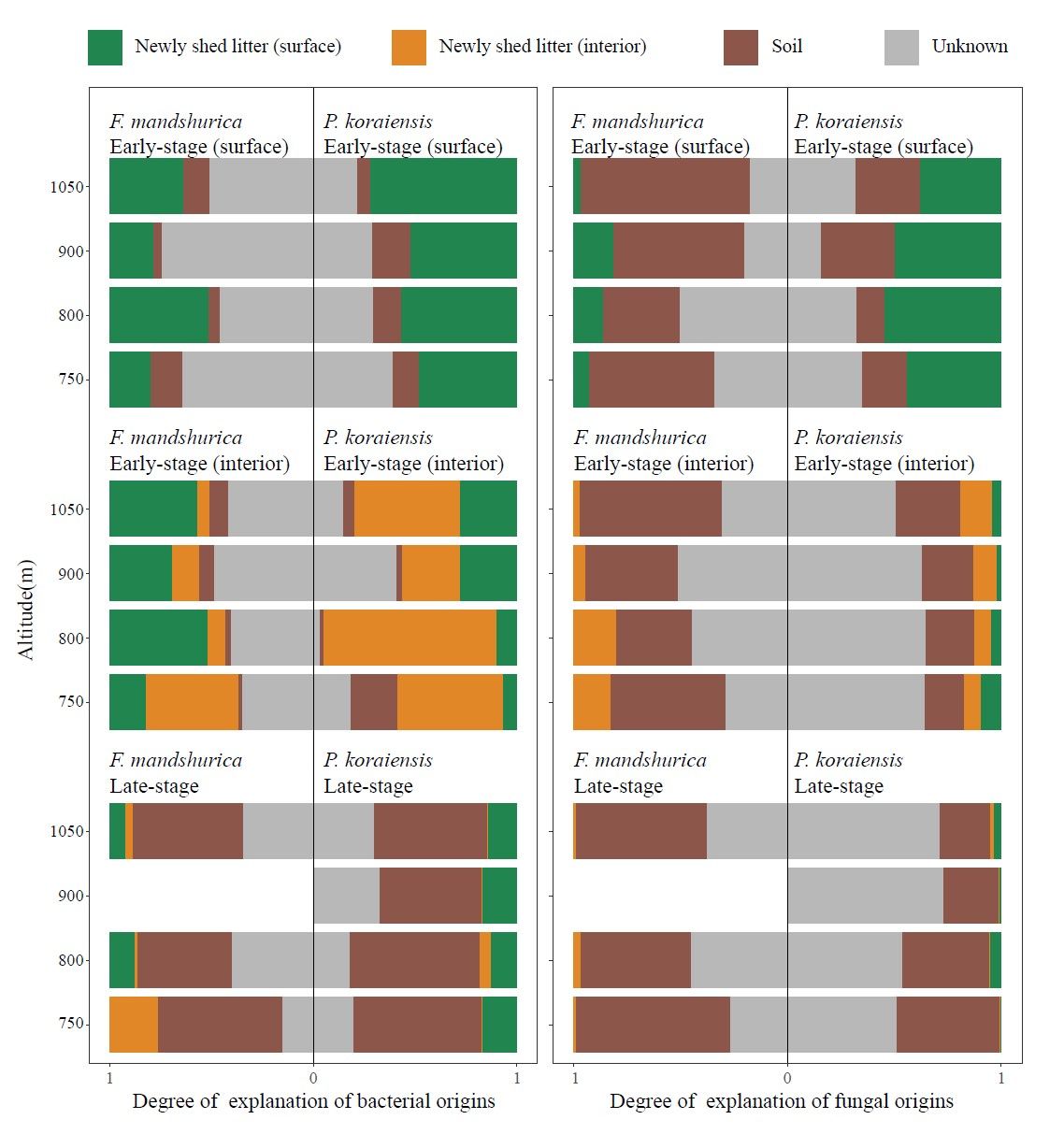 本研究以长白山的两种典型树种——水曲柳(Fraxinus mandshurica)和红松(Pinus koraiensis)为对象,结合不同分解阶段(新落叶、早期分解、晚期分解)和微生物来源(叶际和土壤),利用高通量测序与生态组装模型,系统分析了细菌与真菌群落的来源与演替及其在分解过程中的关键作用。