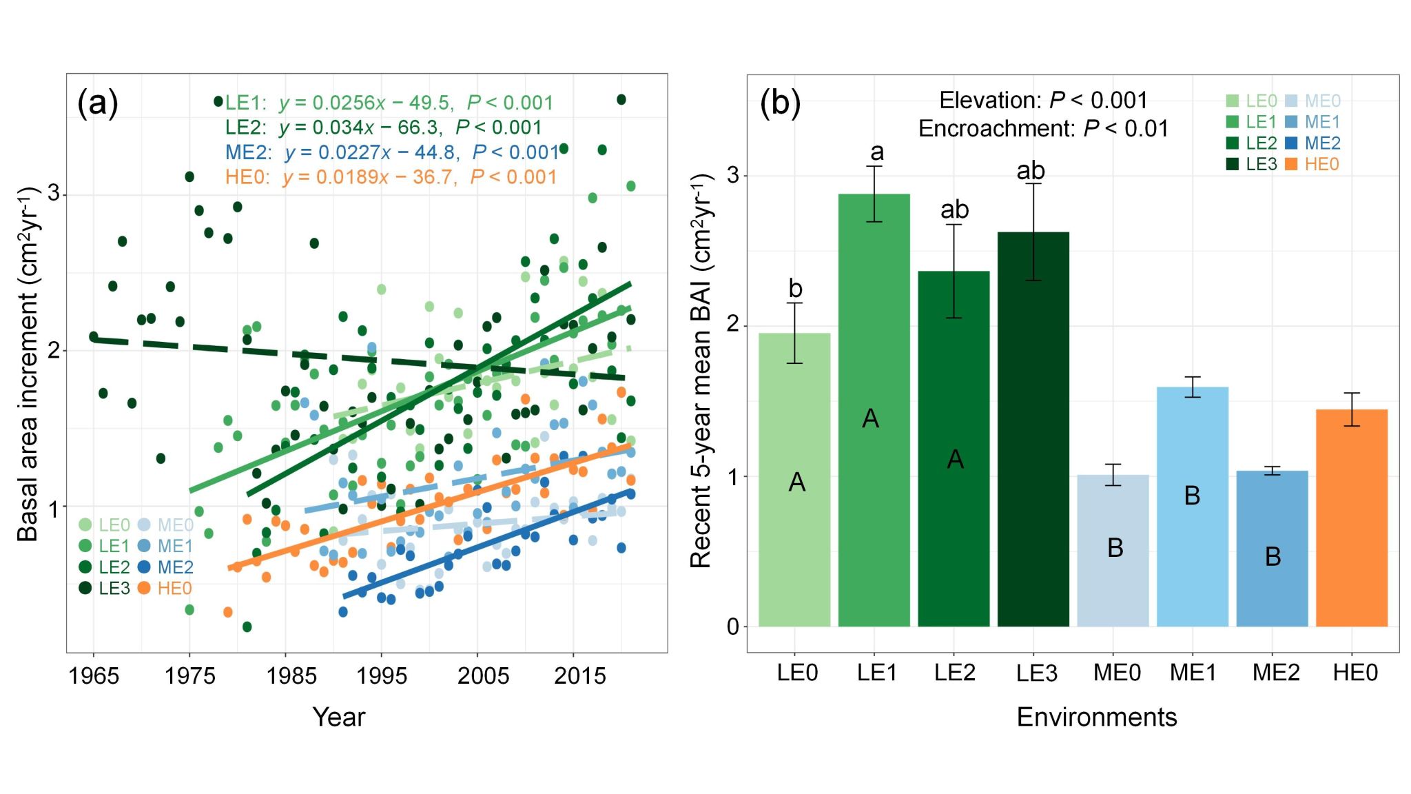 研究成果以“Elevation gradient modulates the effects of herbaceous encroachment on the long-term growth trends and climate sensitivity of Rhododendron aureum in alpine tundra”为题,发表于《Journal of Plant Ecology》中科院一区top期刊上。我院已毕业博士生李娜和硕士生侯素可为该论文的共同第一作者,我院杜海波教授和中科院东北地理与农业生态研究所项目副研究员王雷为共同通讯作者。本研究得到国家自然科学基金、国家留学基金、省教育科研基金以及中科院青年人才计划项目的支持。