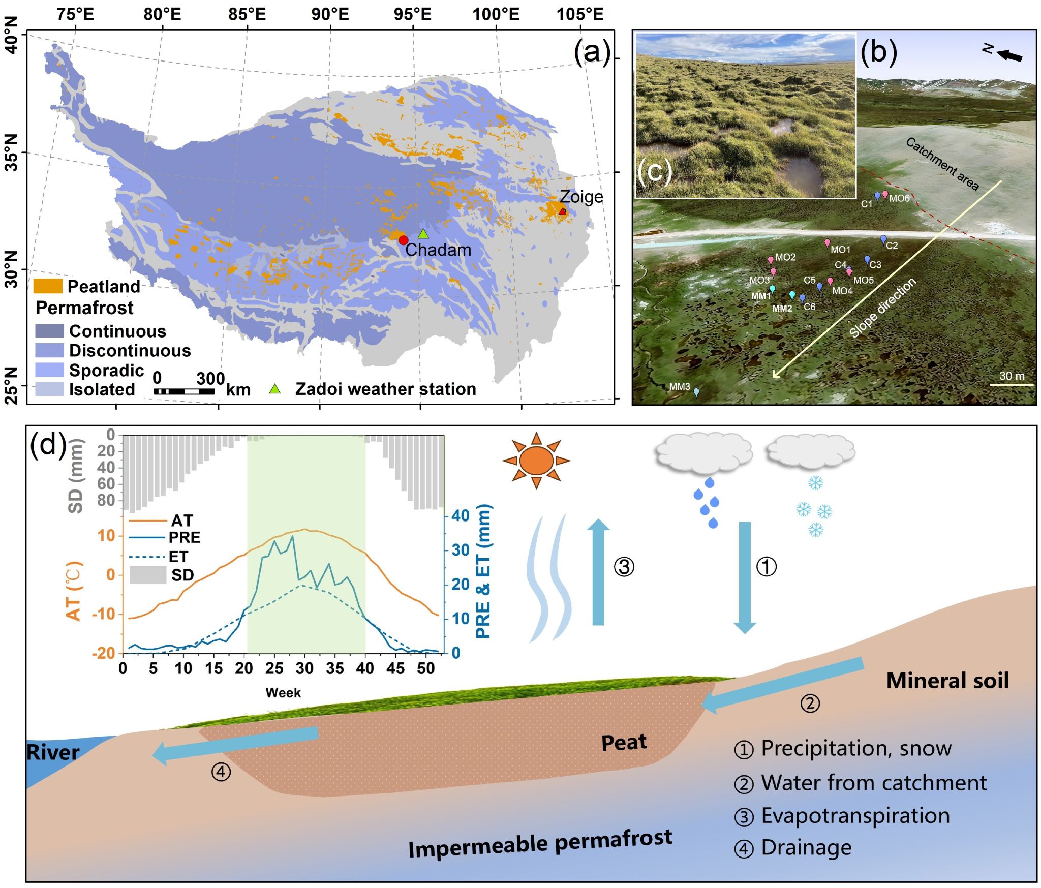 泥炭地作为重要的碳汇和水文调节系统,在全球气候变化背景下的稳定性与功能备受关注。位于青藏高原中部的多年冻土坡地泥炭地,虽面临低净降水量和高坡度地形的双重挑战,但仍能维持较高水位并持续积累泥炭,这一现象的传统解释尚不完善。尤其是在全球气候变暖加速的今天,理解此类高寒泥炭地的水文稳定机制对于评估其碳储存潜力和未来响应至关重要。
