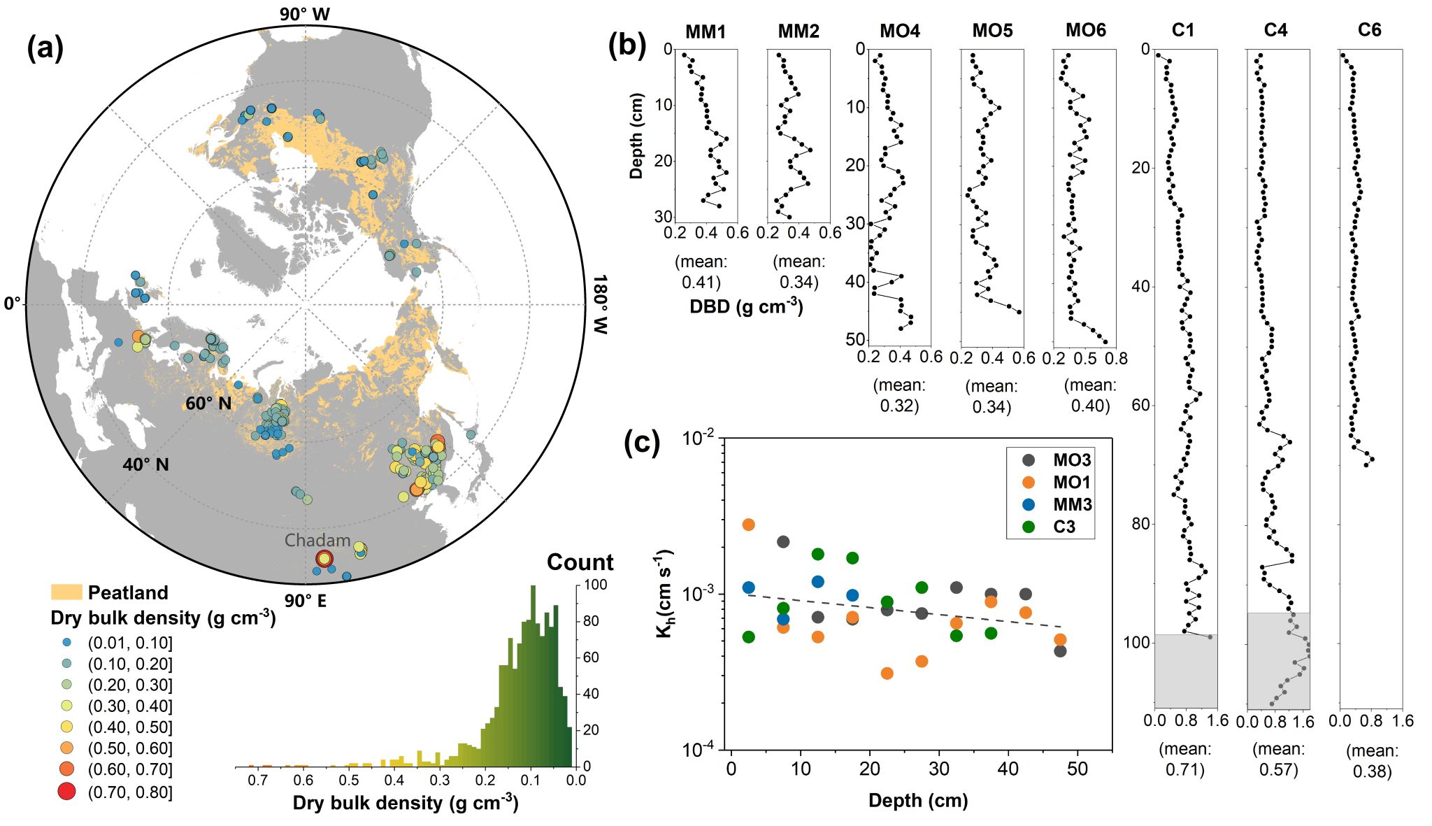 图2. 查旦泥炭地干容重与水平水力传导率特征及其与北方泥炭地的对比
